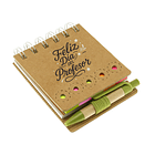 Esta mini libreta de cartón ecológico incluye un lápiz a juego y banderitas de notas adhesivas (post-it), ideal para organizar tareas, marcar páginas y anotar ideas importantes.